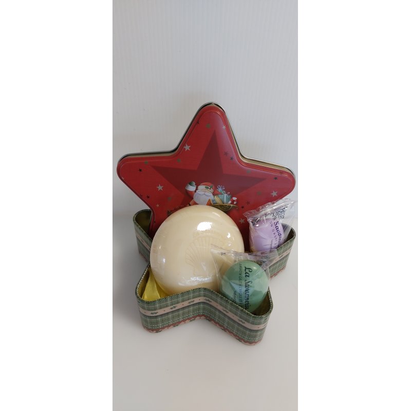 Boîte en fer blanc en forme d'étoile décorée sur le thème de Noël.